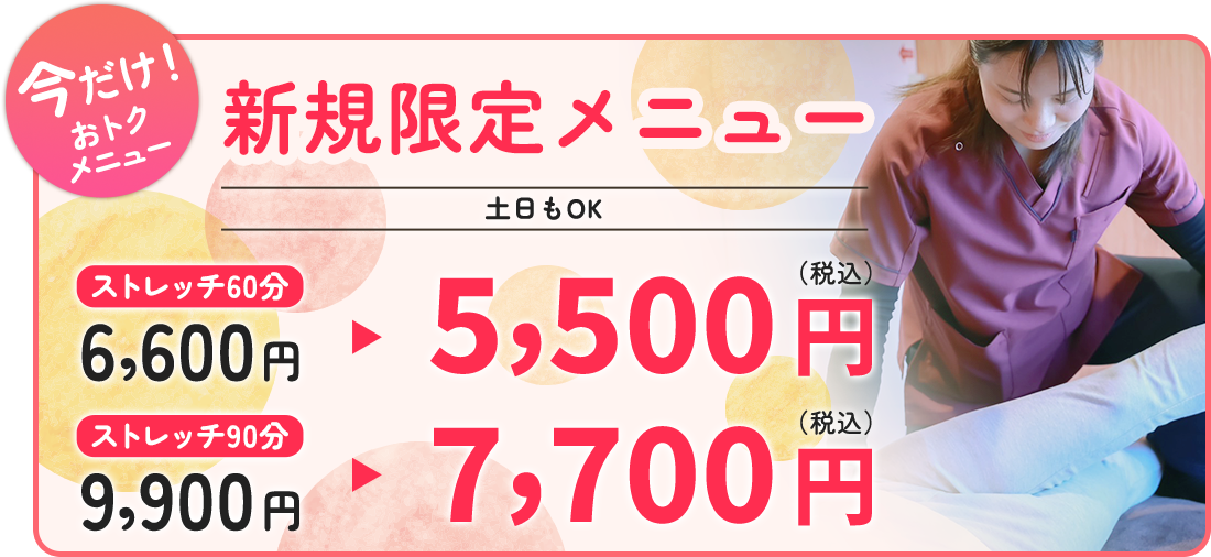 ストレッチを行うことで深い筋肉にまでアプローチができます。全身のめぐりがよくなり、バランスも整うことで、程よくカラダの力が抜けるスッキリ感を感じて下さい。